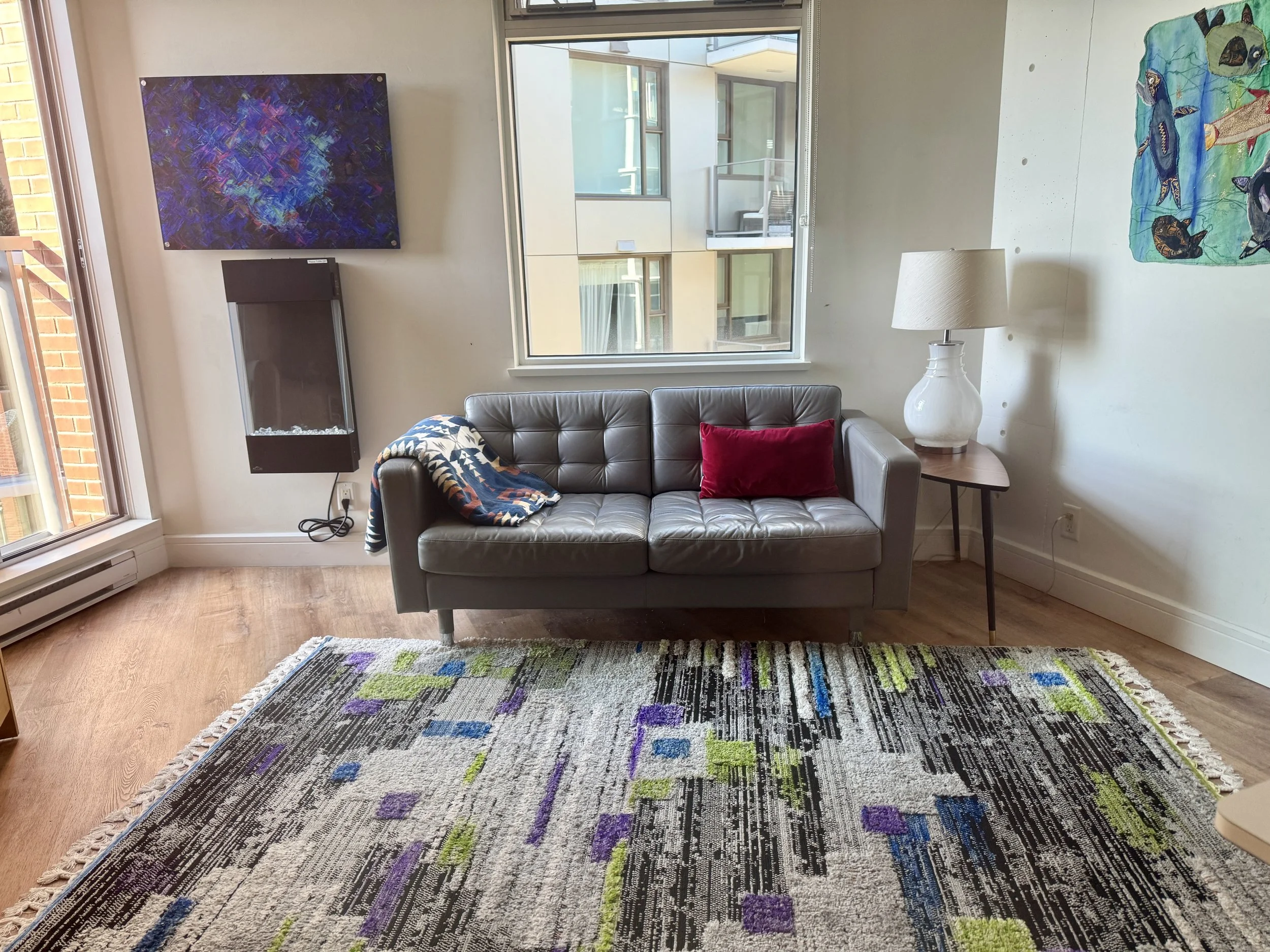 The sophisticated studio suite boasts an open-concept design, high ceilings, a leather couch and incredible local artwork. Modern, upscale appliances and amenities like the electric fireplace complement our intimate space. Guests sleep on a comfy queen-size mattress topped with high-end pillows and bedding; moreover, the smart European-style Murphy bed easily transforms into a dining table, creating a clever dining space. Finally, this suite has a high-efficiency, in-suite washer and dryer with detergent, high-speed wifi, smart television with access to all your favourite streaming services.