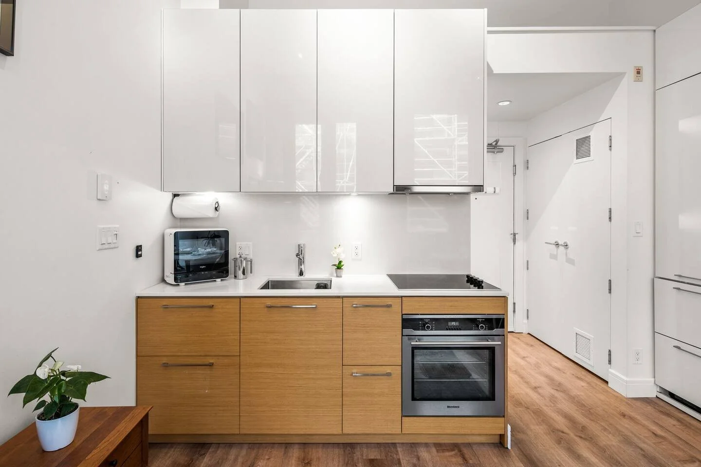 This vibrant and modern studio boasts an open-concept design with beautiful exposed brick, high ceilings, and abundant natural light from the building's original architecture. Modern, upscale appliances and amenities like the electric fireplace complement these historic features. Guests sleep on a comfy queen-size mattress topped with high-end pillows and bedding; moreover, the smart European-style Murphy bed easily transforms into a dining table, creating an intimate dining space for two. Finally, this suite has a high-efficiency, in-suite washer and dryer with detergent, high-speed wifi, smart television with access to all your favourite streaming services.